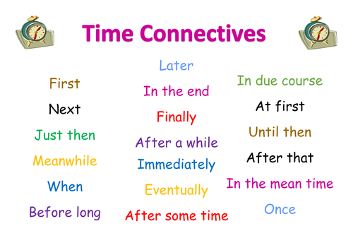 TIME EXPRESIONS (PAGES 18,19): AT FIRST, IN THE END, EVENTUALLY, BEFORE, AFTER, AS SOON AS, AS, WHILE, LATER, BY THE TIME